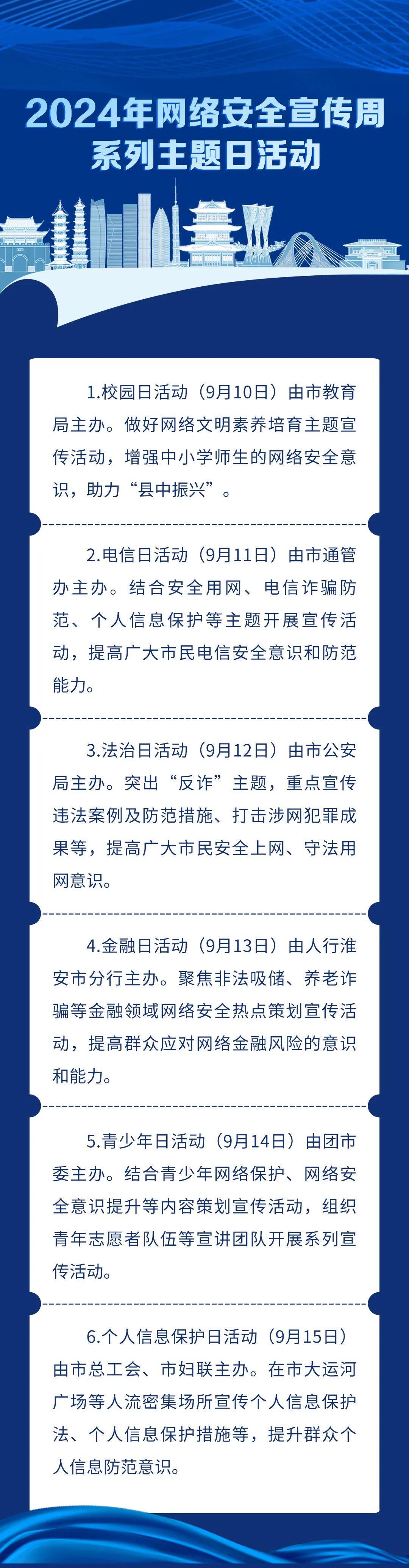 据悉,本次网络安全宣传周由市委网信办会同市教育局、市公安局、市人行、团市委、市总工会、市妇联、市通管办、清江浦区委网信办共同举行。将于9月9日—9月15日在全市范围内统一开展。活动期间除了开幕式网络安全系列宣传活动之外,还将开展2024年淮安市网络安全知识竞赛、网络安全知识宣讲、网络安全系列主题日等多项活动。