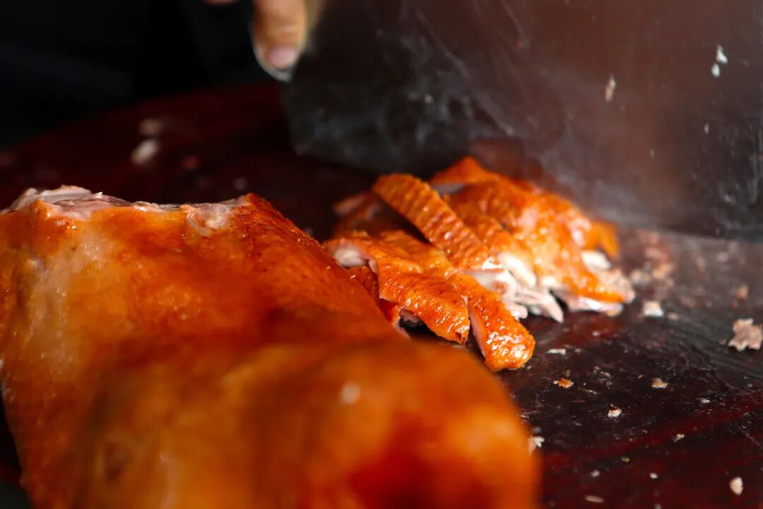 “张师傅,半只鹅,多放辣椒油!”“给我来半只,加素鸡和海带!”上午十点,“加强麻辣鹅”开门营业,熟客们早已排起长队。“好嘞!”张加强手持菜刀,动作麻利地顺着鹅肉纹理下刀,每块鹅块大小均匀、边角分明,很快就在案板上码成整齐的一堆。切好的鹅块淋上滚烫的原卤汁,再浇上现熬的辣椒油,红色油花在鹅肉表面滚动,香气瞬间浓烈到极致。