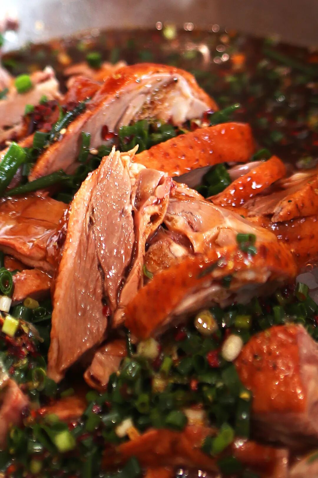 走进后厨,一股浓郁的香料香气扑面而来。一口直径近一米的大铁锅架在灶上,锅内是张加强亲手调配的秘制卤汤,这也是“加强麻辣鹅”好吃的关键所在。老鹅入锅后,先用大火煮沸,再转文火慢炖四小时,让卤汤的精华在时光中缓缓渗透到鹅肉的每一寸肌理。当第一缕阳光照亮洪泽湖,卤锅中的老鹅终于出锅。揭开锅盖的瞬间,蒸腾的热气裹挟着浓郁的香气喷涌而出,弥漫在整个后厨。雾气散去,一只只色泽红亮油润的麻辣鹅展露真容,卤汤的光泽在鹅肉表面流转,让人食指大动!