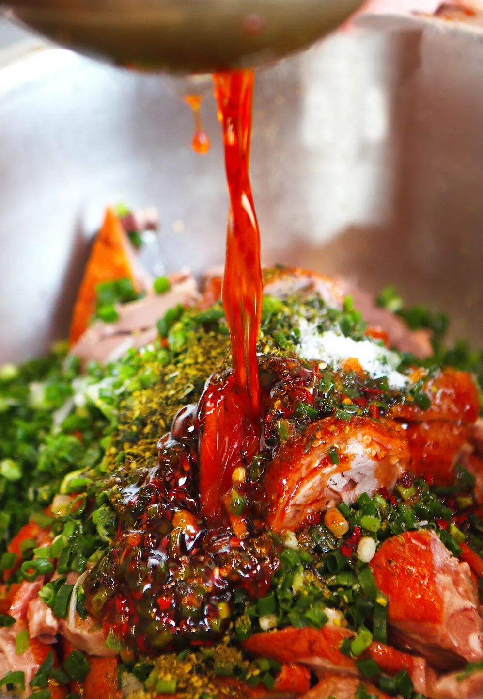 “我们的辣椒油看着红亮,其实辣度已经调整过了。”张加强说,为了适应淮安人偏清淡、重本味的饮食偏好,他对辣椒油进行了改良,降低了辣度、提升了香气,即便浇上满满一勺,吃起来也只觉香辣过瘾,却不刺激肠胃。更特别的是,“加强麻辣鹅”不添加蒜泥和香菜,“要让食客吃到鹅肉本身的鲜,香料的香,不能让其他味道抢了风头。”